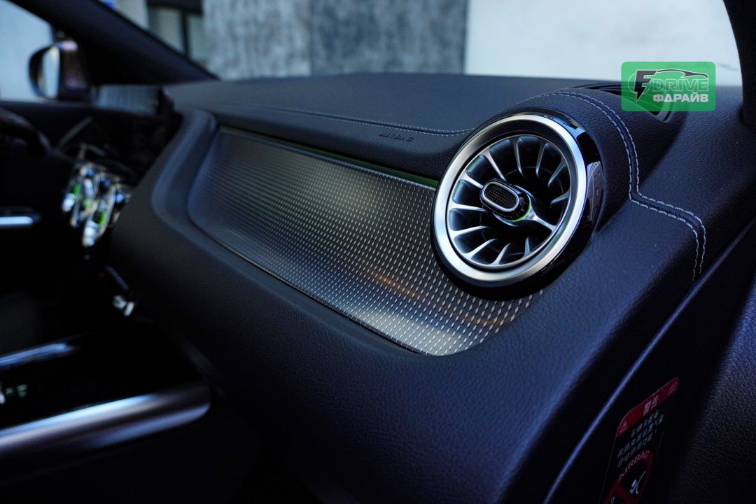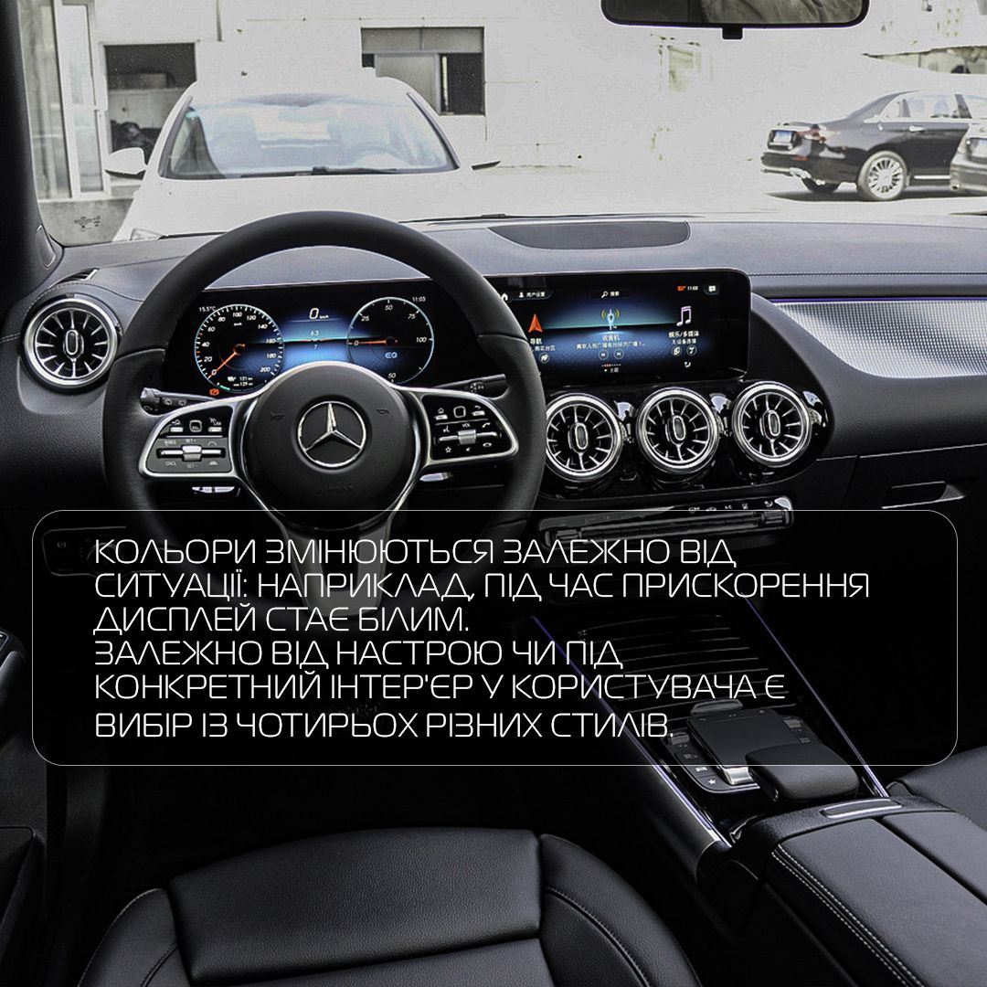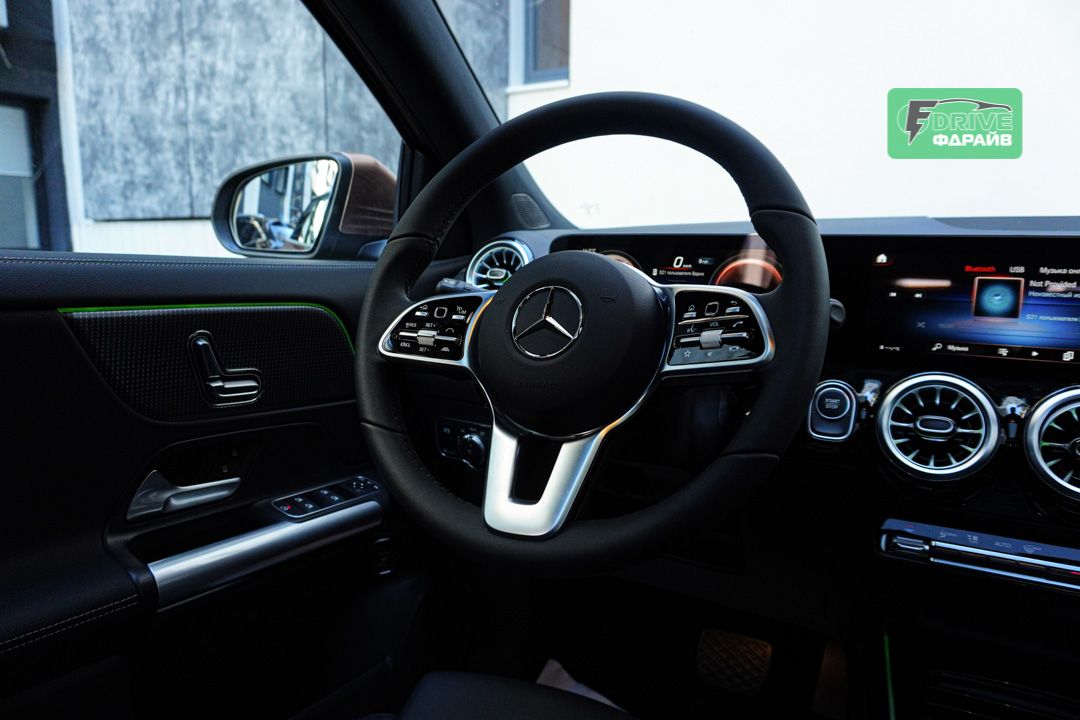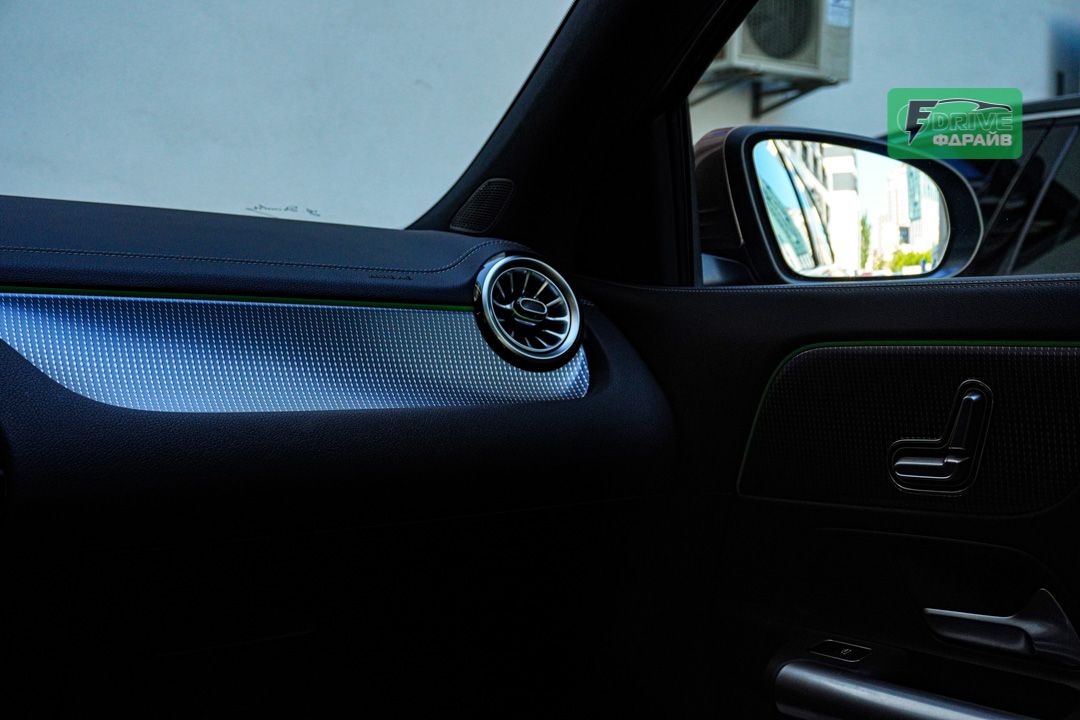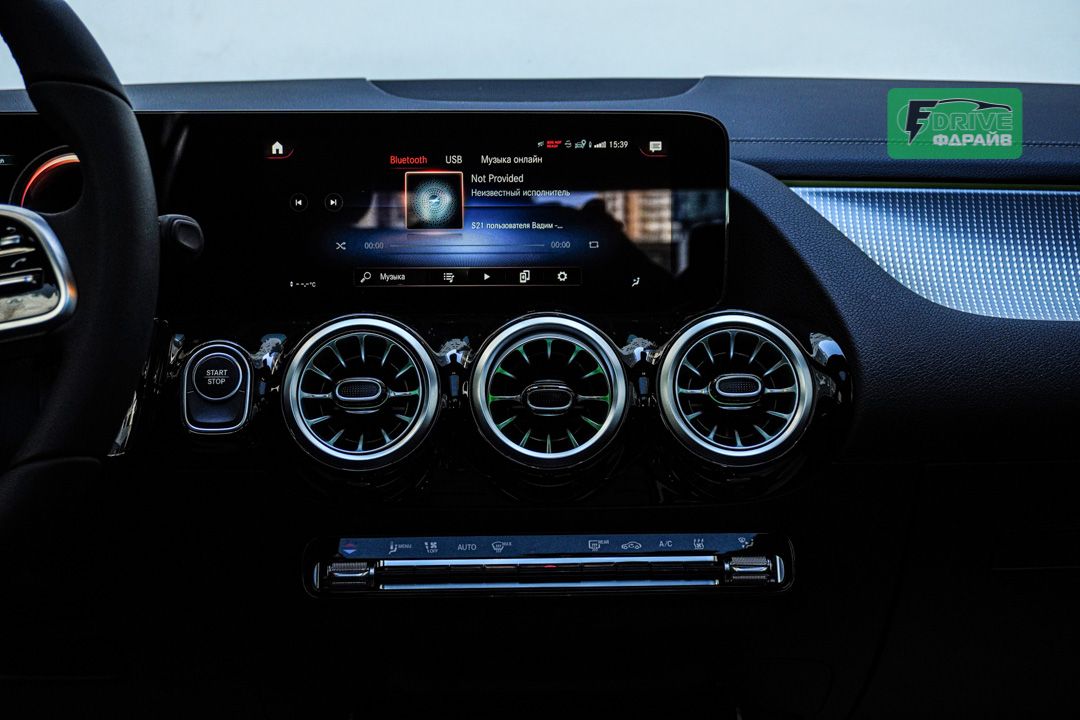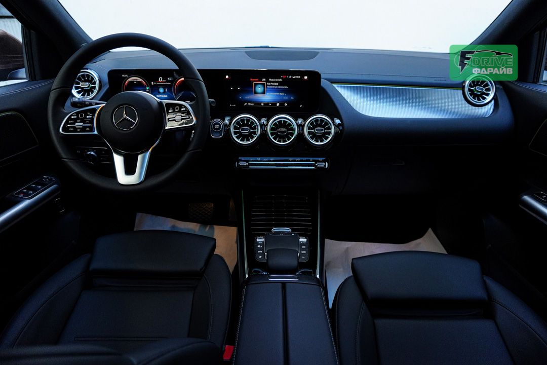В салоне установлен футуристический двойной дисплей диагональю 10,25 дюймов, парящий над панелью. 64-цветная система подсветки создает неповторимую атмосферу высоких технологий и роскоши. Интеллектуальная система MBUX позволяет управлять функциями голосом и использовать навигацию AutoNavi.